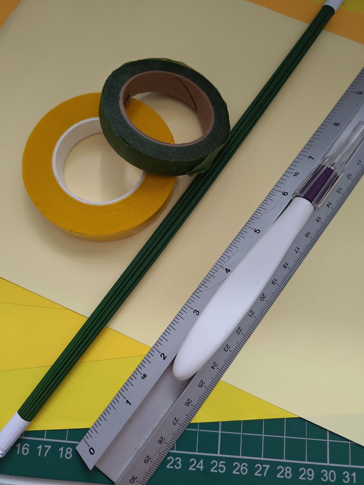 To make the daffodils, you will need some yellow paper in various shades, some thick florist’s wires and some florist tape in green and yellow. You will also need a cutting tool – I use a craft knife and cutting mat, but scissors will also work.