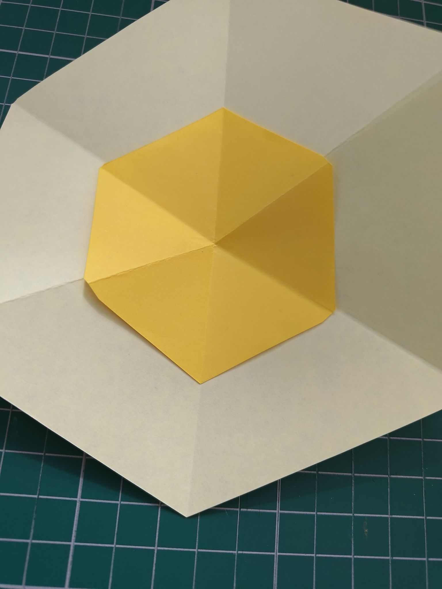 You have to be quite confident with reverse folding in order to collapse the model. To colour the centre, you can glue the smaller hexagon to the back of the collapsed model – it will make folding a bit more difficult as there are more layers but the result is quite nice.