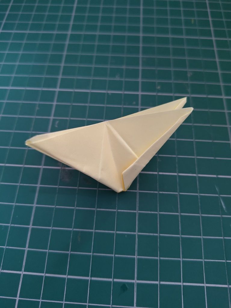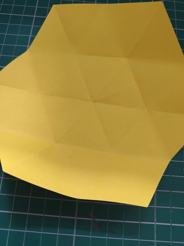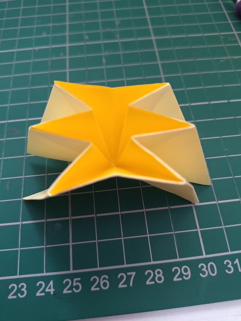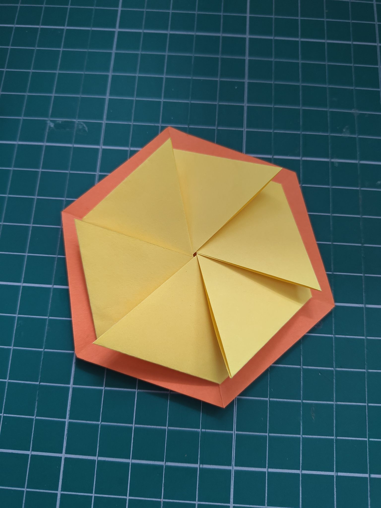 To start with, I created hexagon shapes from a 15cm square of yellow paper. To make the daffodils with different-coloured centres, another hexagon shape from a 7.5cm square of paper needs to be made. I made the second hexagon slightly bigger from 9cm squares instead to ensure they would fit.
