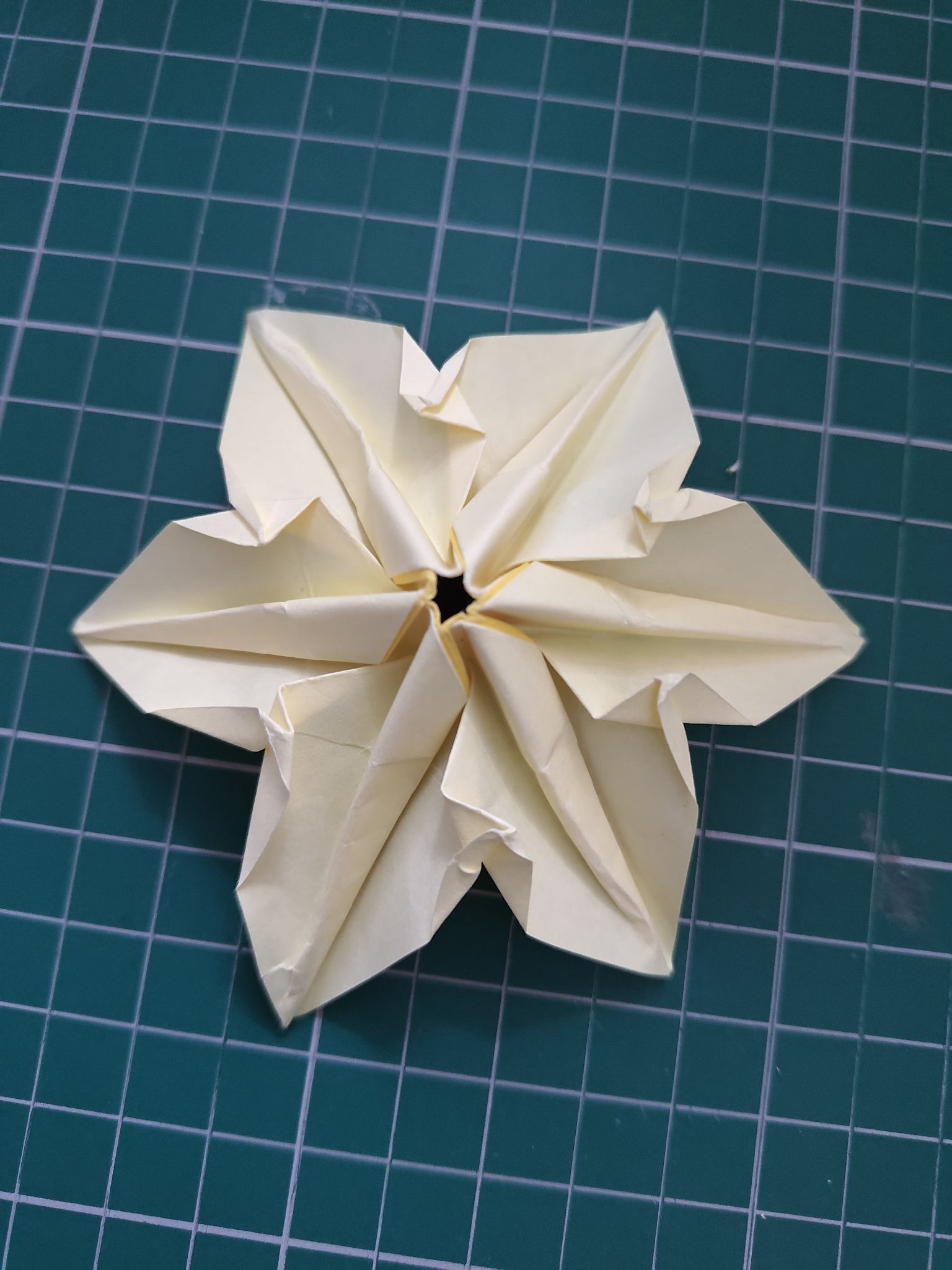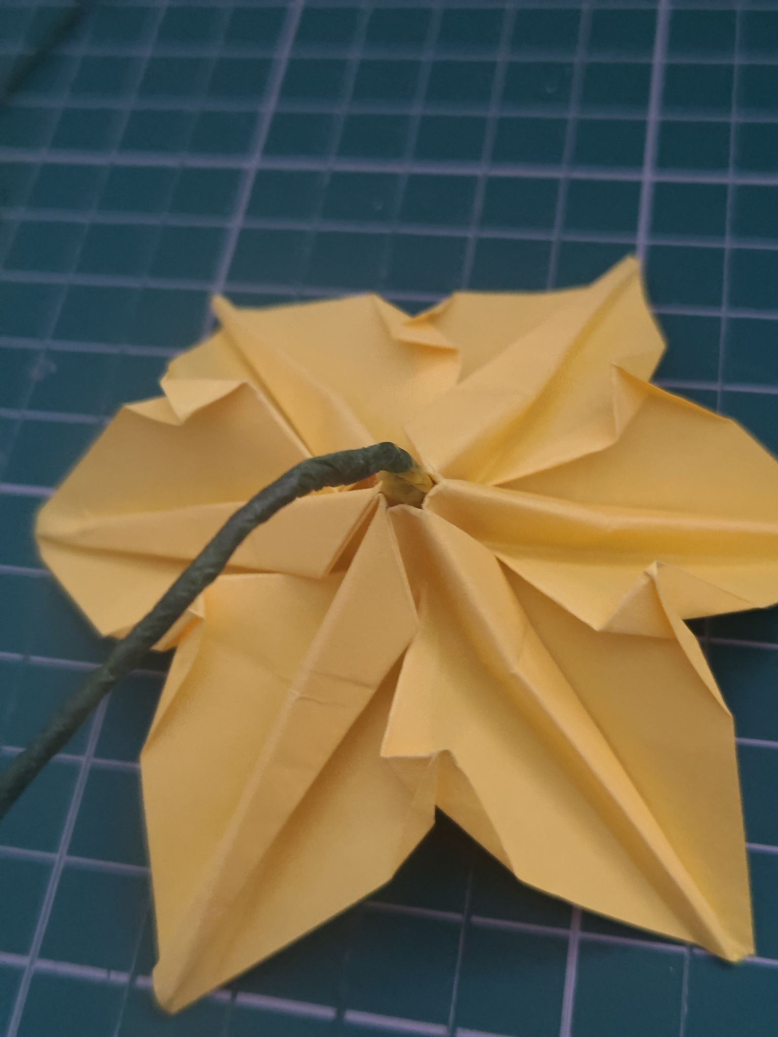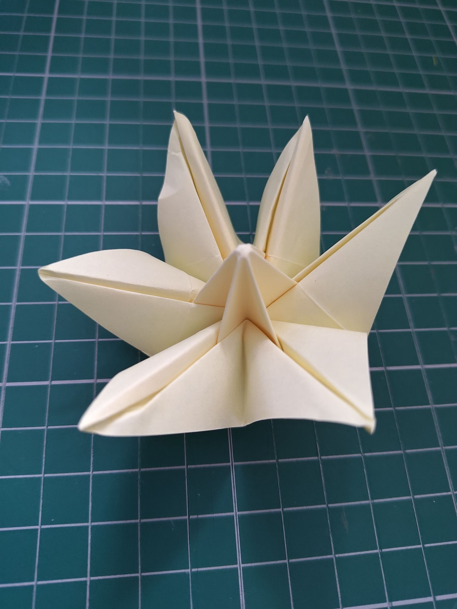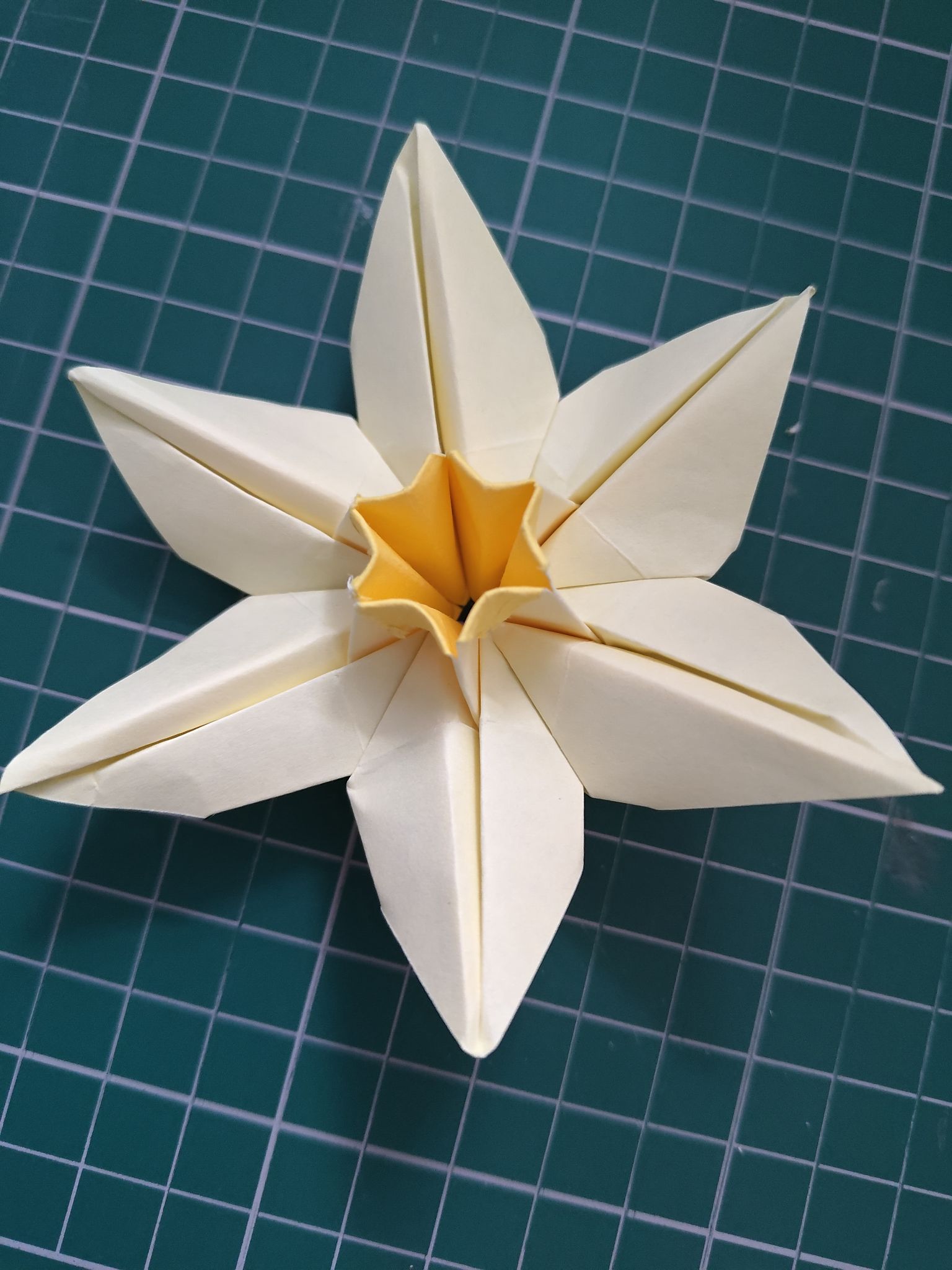 There are a lot of ways to create a daffodil from paper (you could use papercraft or kusudama units), but I am following the method in the book Origami Flowers by Hiromi Hayashi. This book shows you how to do a six-petal daffodil.