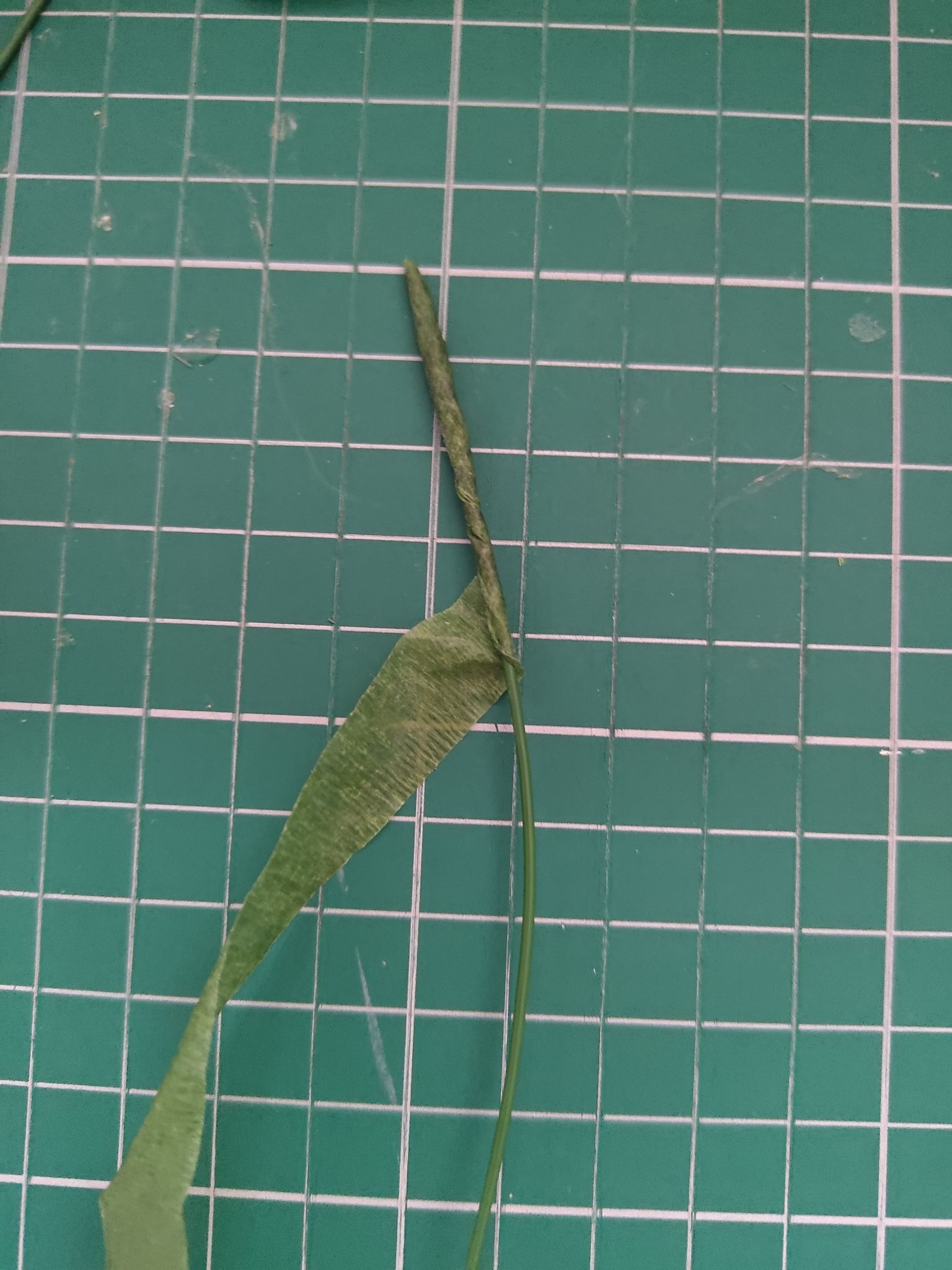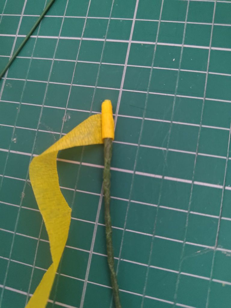 To make the stem, you need a thick florist’s wire. I wrapped it with green florist tape to make it wider, then I wrapped the end with yellow florist tape to make the stamen. Yellow florist tape is not so easily found in craft stores, I ended up having to buy this online.