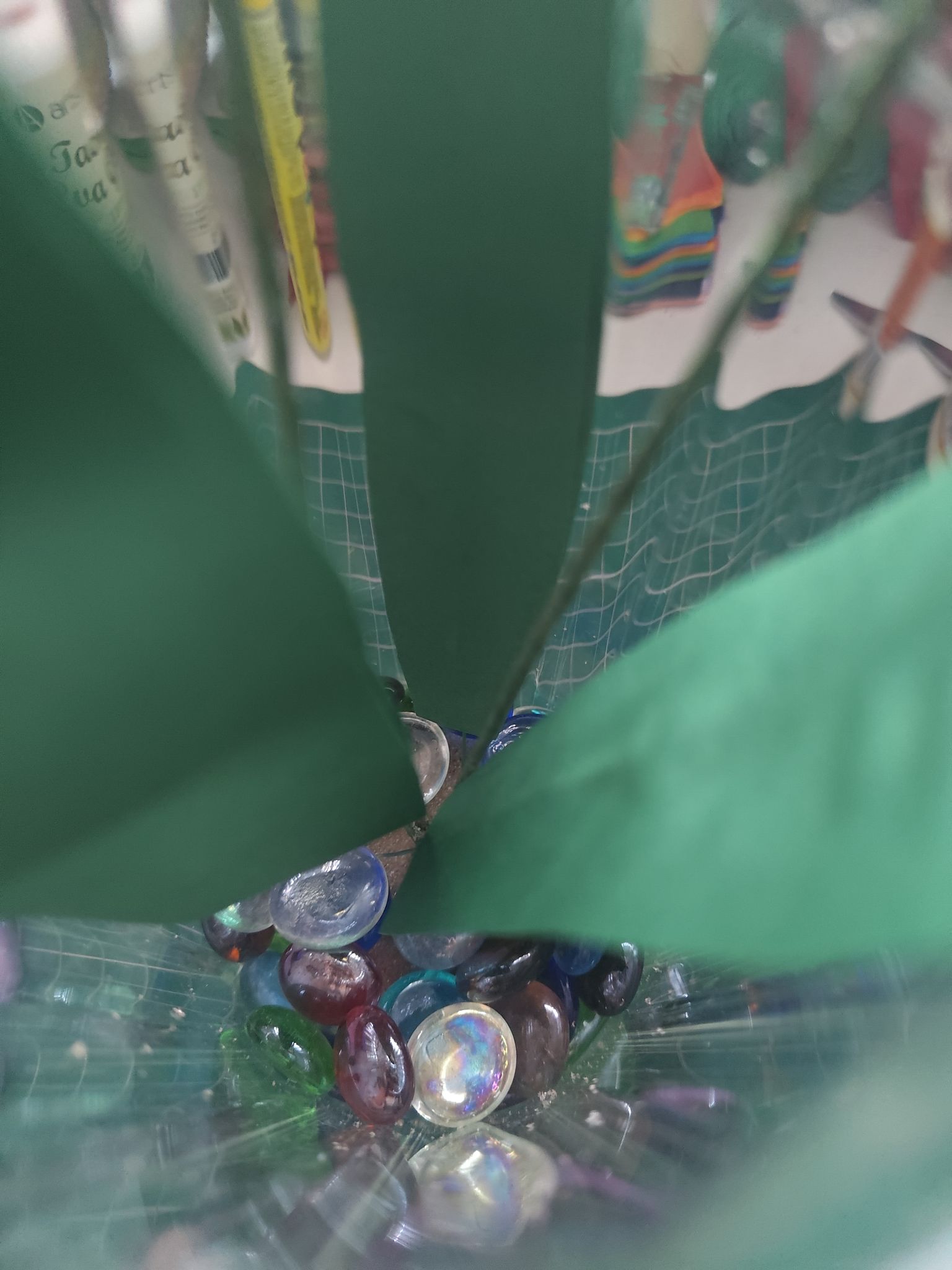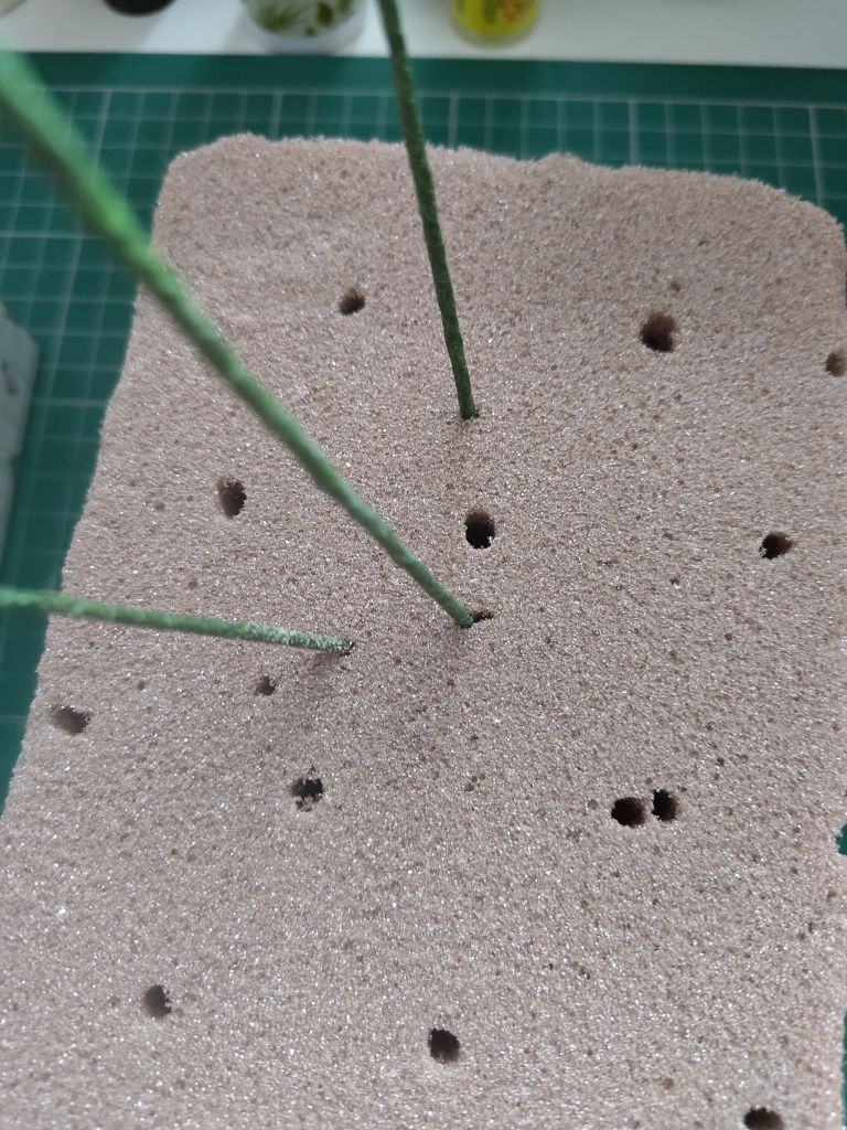 I put together some leaves by cutting out long shapes in dark green paper and sandwiching them together with a thin florist’s wire and wood glue. To cover the oasis foam, I had some coloured glass pebbles usually used for vase filler.