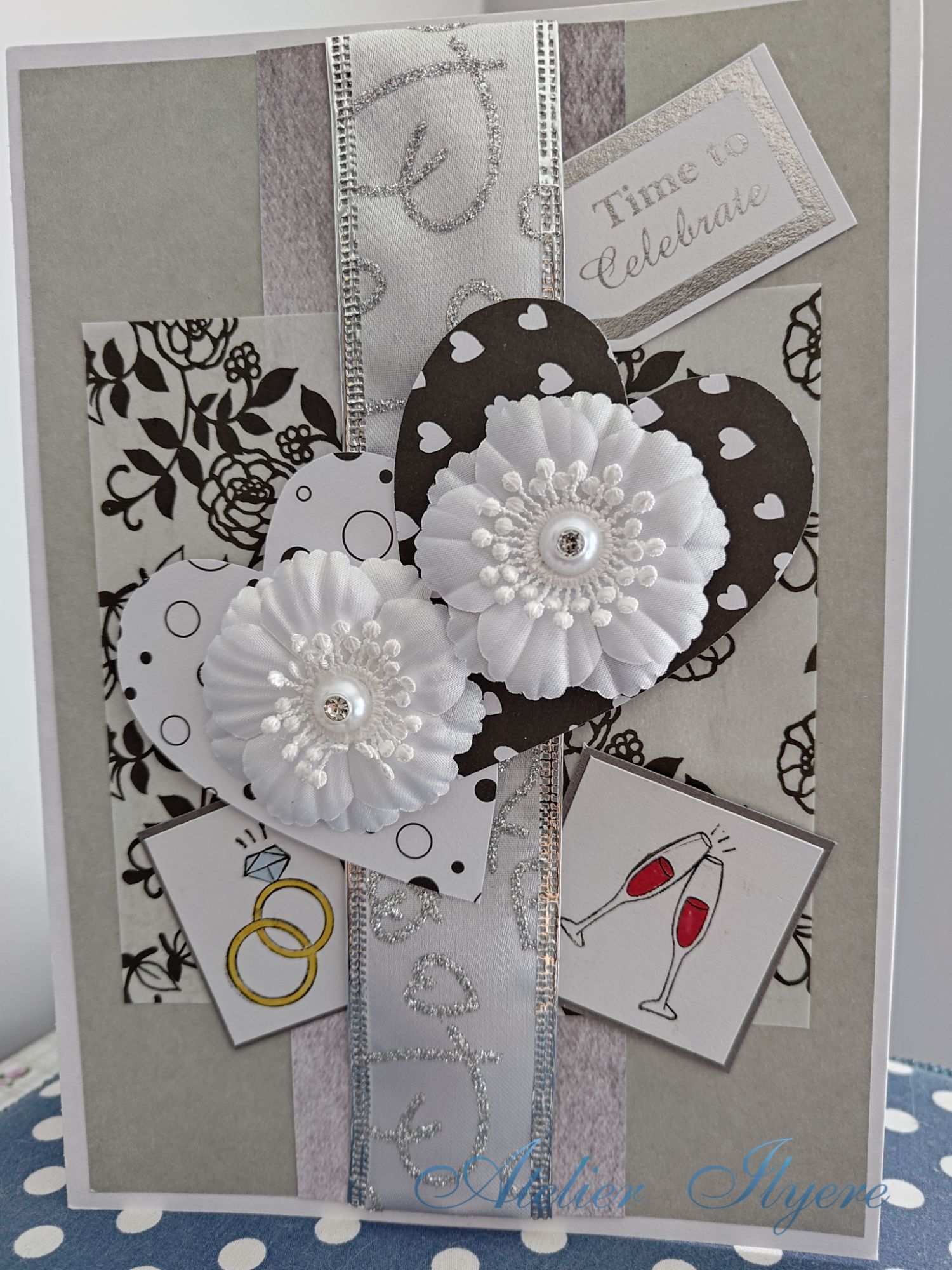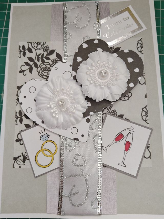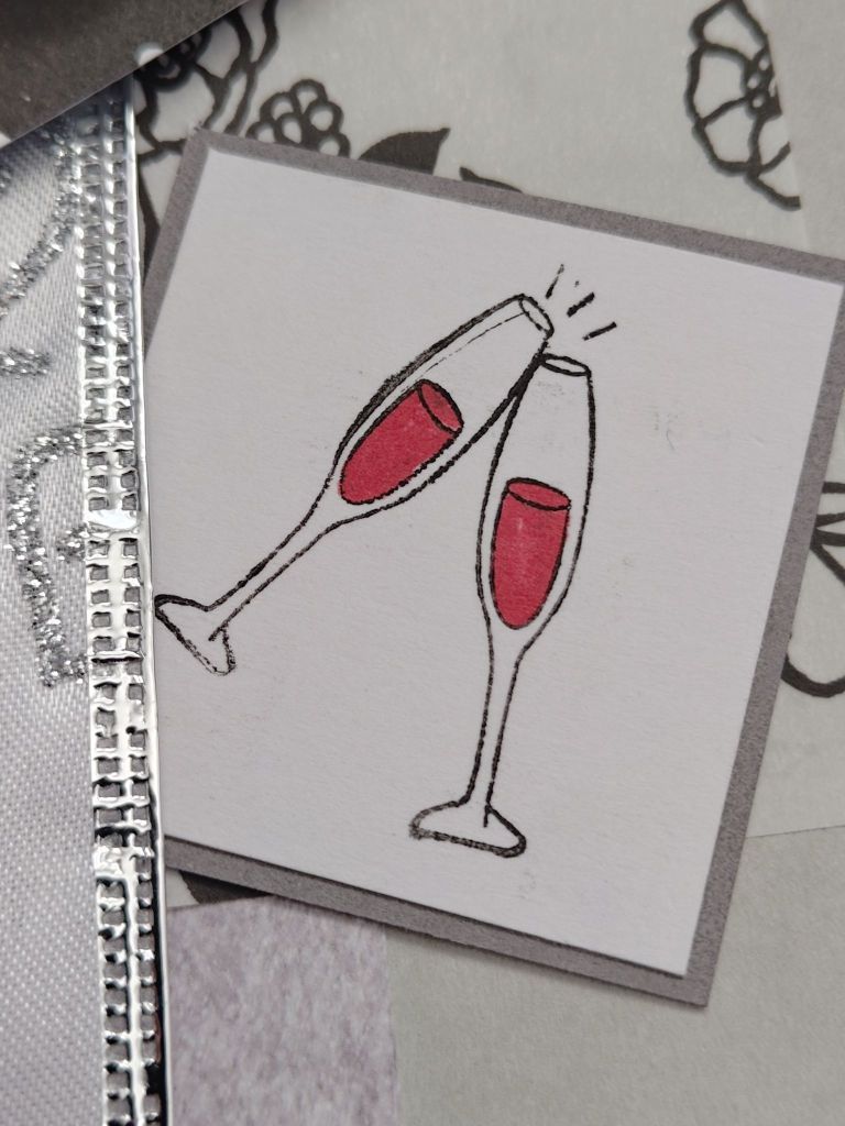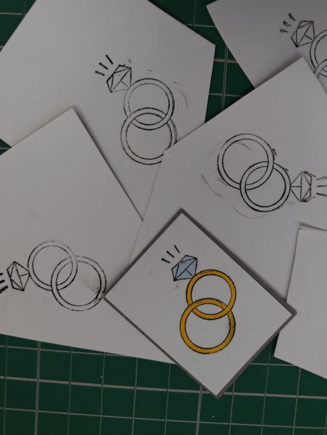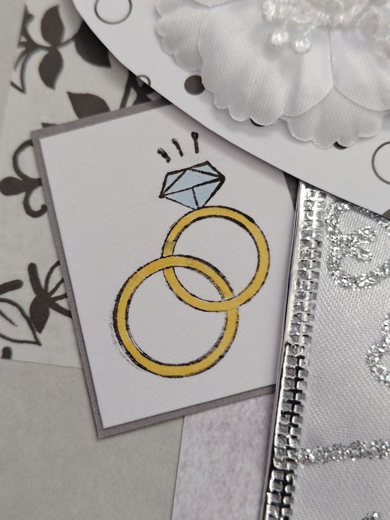 I coloured the stamped designs in with coloured markers. It does go against the monochromatic colour scheme I had going on here, but I thought the stamps would look weird without any colour! I used the pair of wedding rings and the pair of wine glasses stamps, then I cut the white card down to size and stuck them to grey card backing.