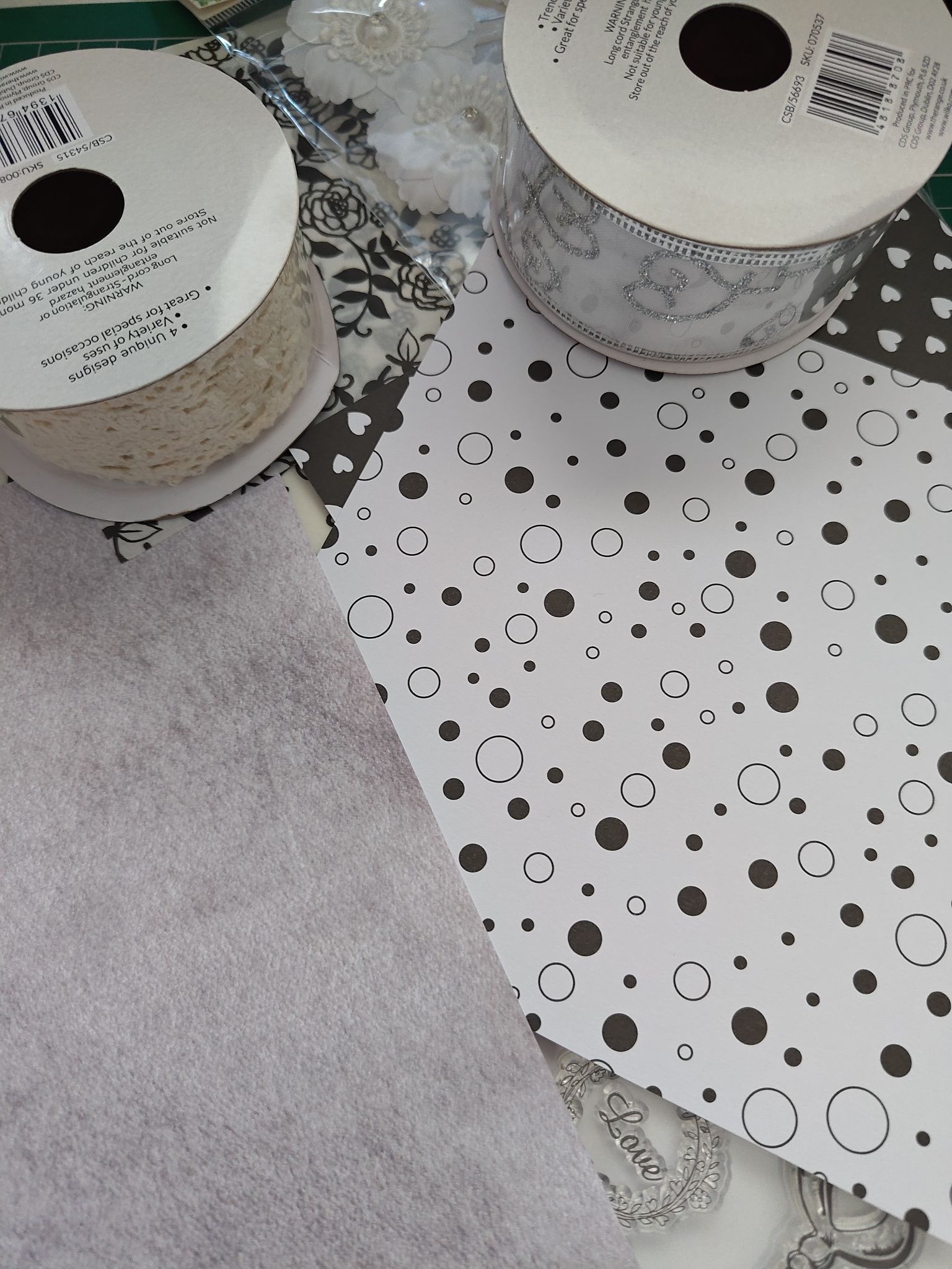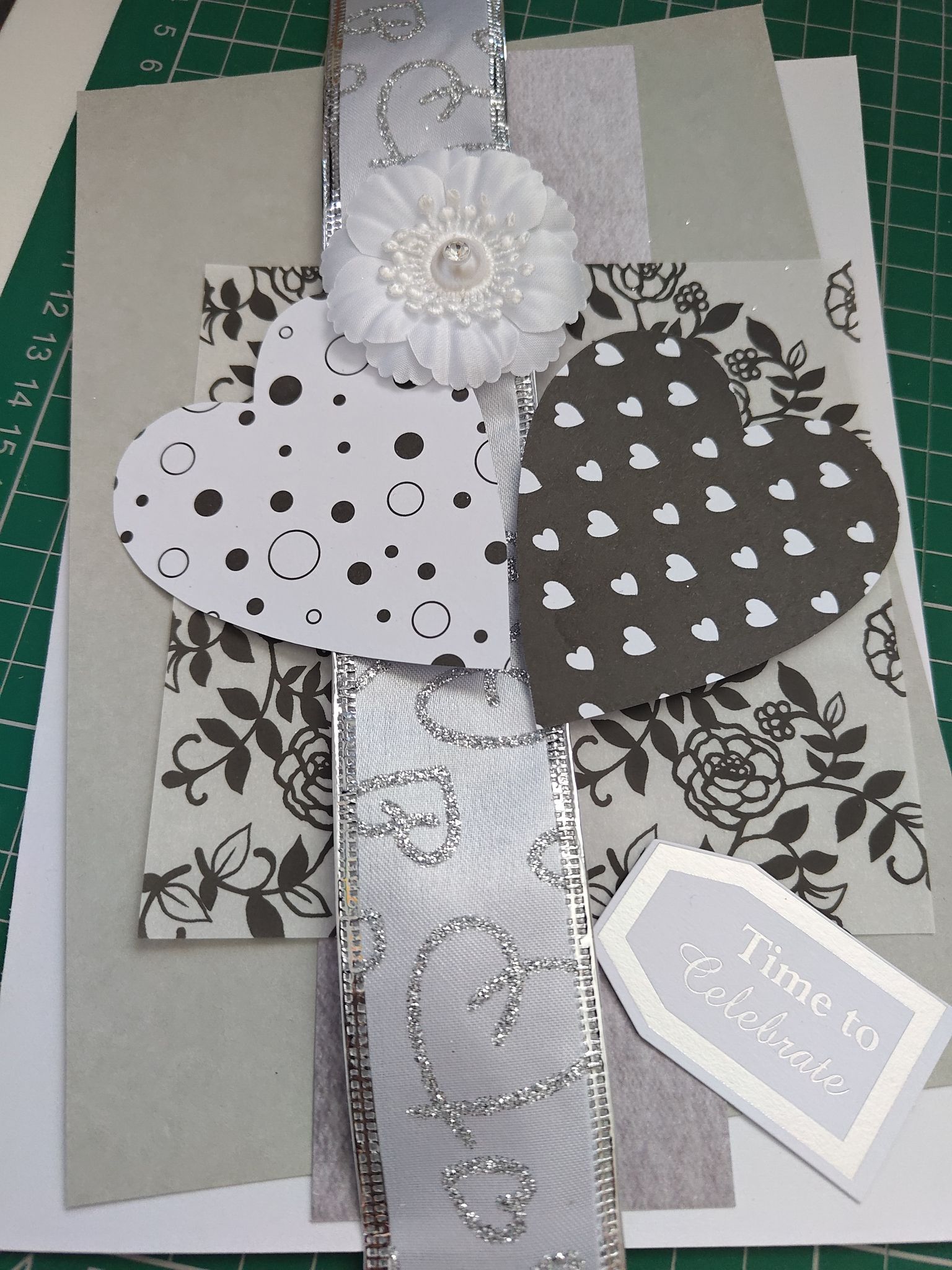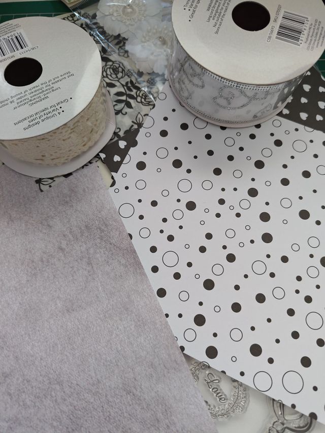 I also cut out various shapes and sizes of card, vellum and ribbon. The floral pattern on the vellum was what prompted me to make a black and white wedding card in the first place! I also had some sticky white flowers and a printed sentiment that I wanted to include in some way.