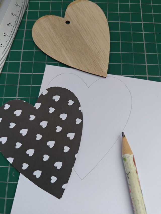 I liked both the black and white patterns and wanted to use them both, so I took a spare wooden heart from a previous project and traced and cut out hearts. Cutting by hand can sometimes leave rough edges so I had to trim them a few times.