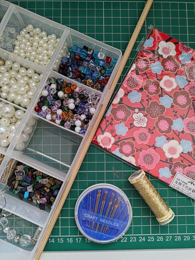 I made my origami butterfly curtain almost two years ago now! As a first attempt, it was quite easy to make and assemble, so there are many ways I could potentially improve on it. Better quality paper and beads for adorning were my initial ideas, so it is a good thing that I keep trays of assorted beads lying around! I also had some leftover sparkly gold thread to add to the sparkle.