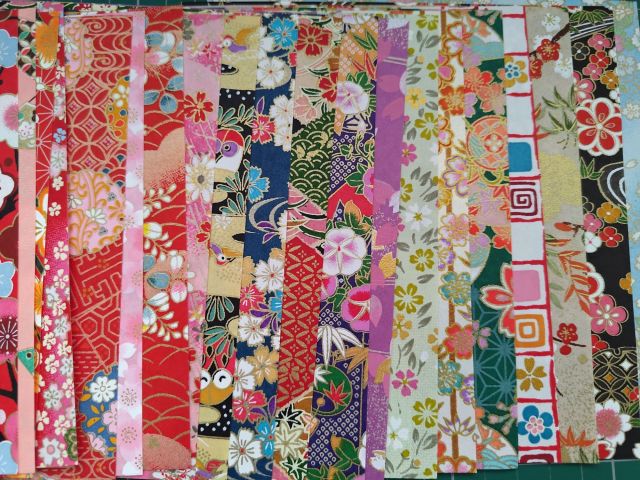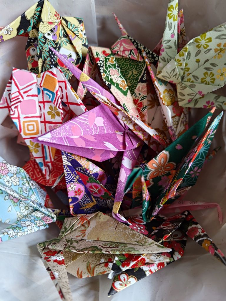 In one day I folded all the cranes and gathered them up in a basket. (I would sit in front of the TV and continue my folding so I needed a mobile carrier!) When I took them back up to my craft room, I grouped the cranes in general colours – black, pink, red, and everything else. Since I have four groups of five cranes, I decided to mix up the colours in each string of four cranes.