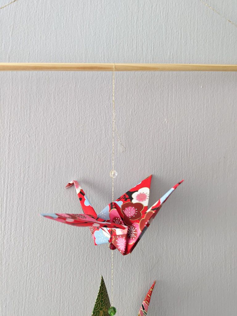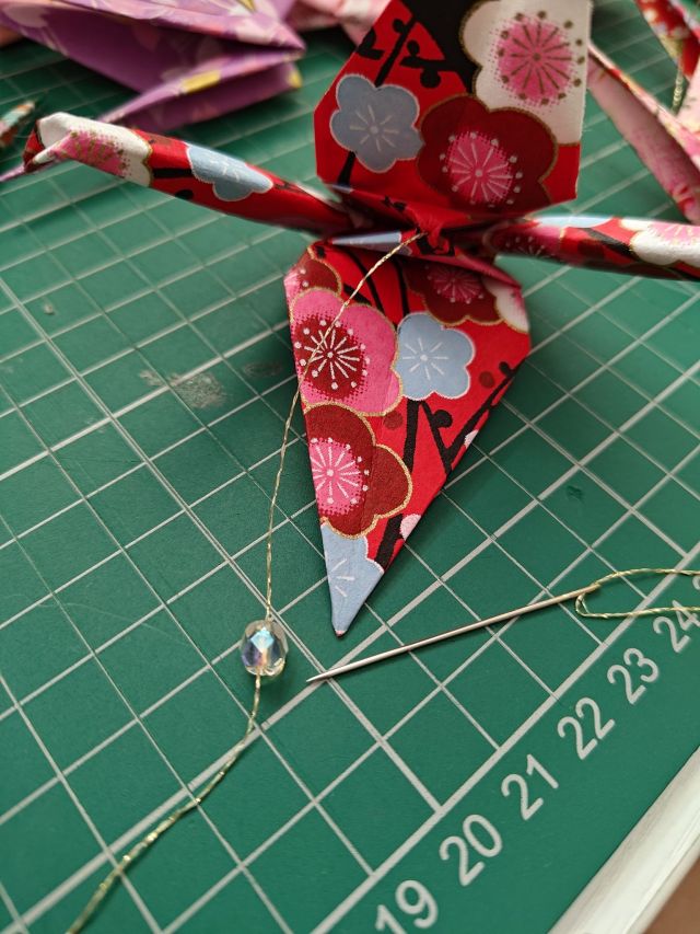 I threaded the smallest appropriate needle and added beads and cranes. The gold thread that I used was very thin, very delicate and prone to snapping. Rather than tying knots under each bead, it was much easier to loop around the bead to hold the cranes in place.