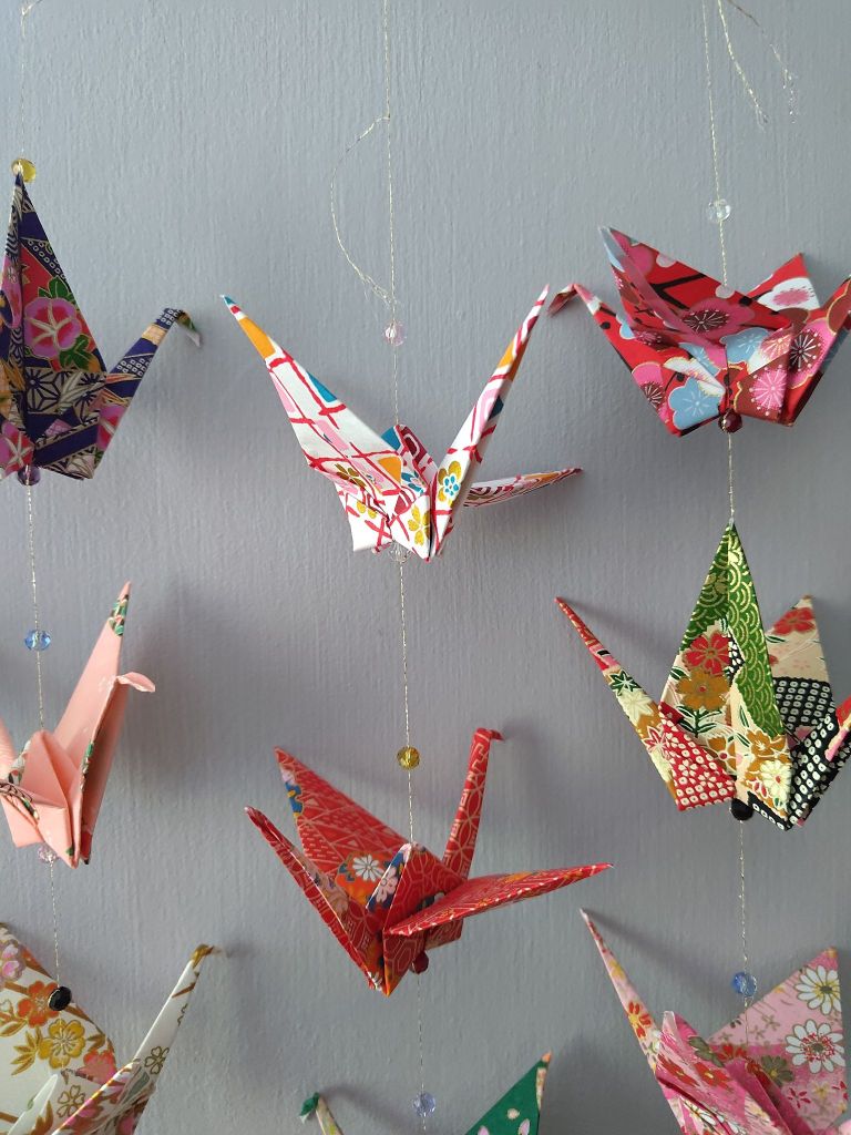For each crane, I would put a non-matching colour glass bead above the crane and a matching colour below. I tried to keep about 5cm between each bead but I measured it by eye.