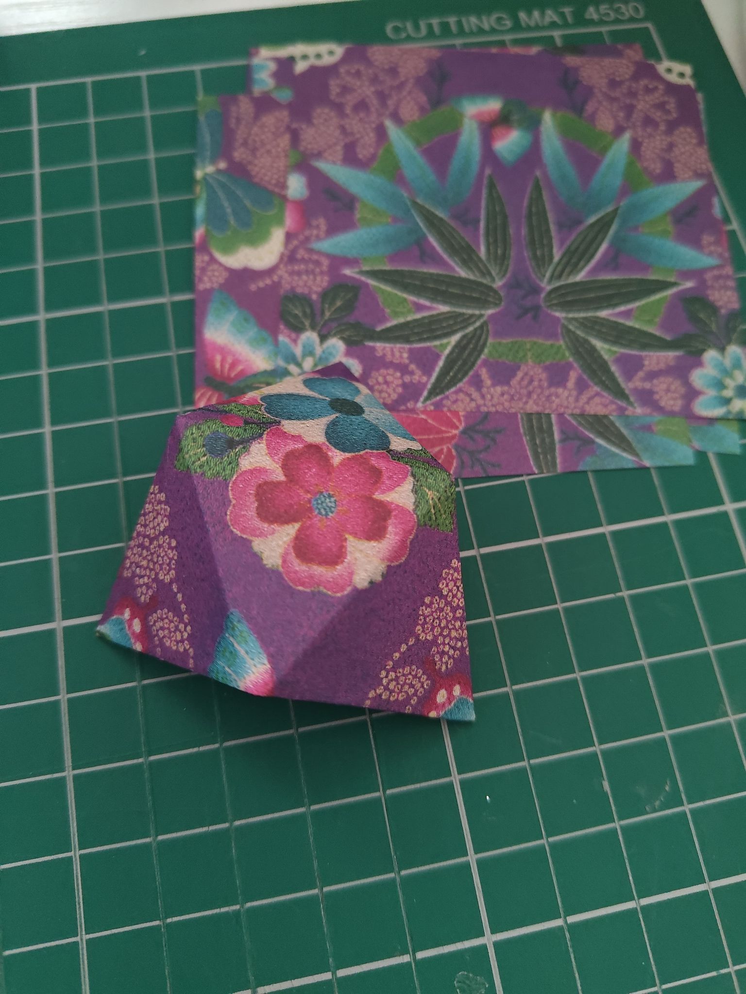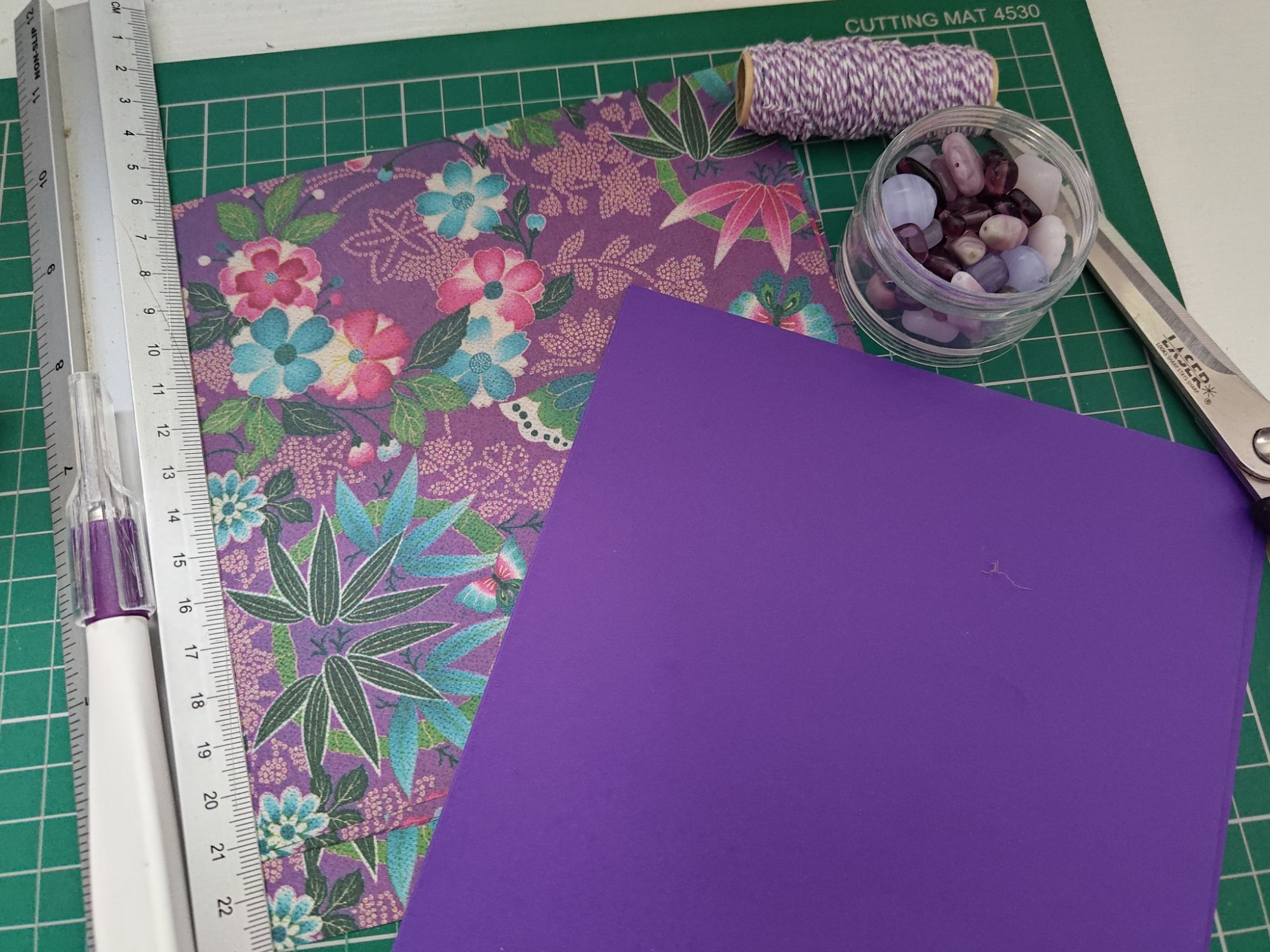 The model uses a mix of solid colours and patterns. I actually had some leftover dual-side purple paper, so I picked out a matching pattern to go with it. The solid colour needs to be 15cm, and the patterns need to be smaller, which I usually cut down to size using a craft knife and cutting mat.