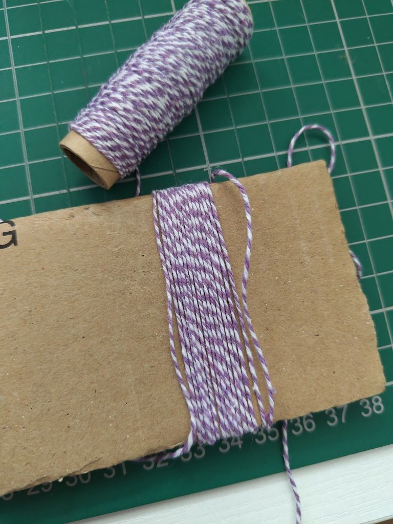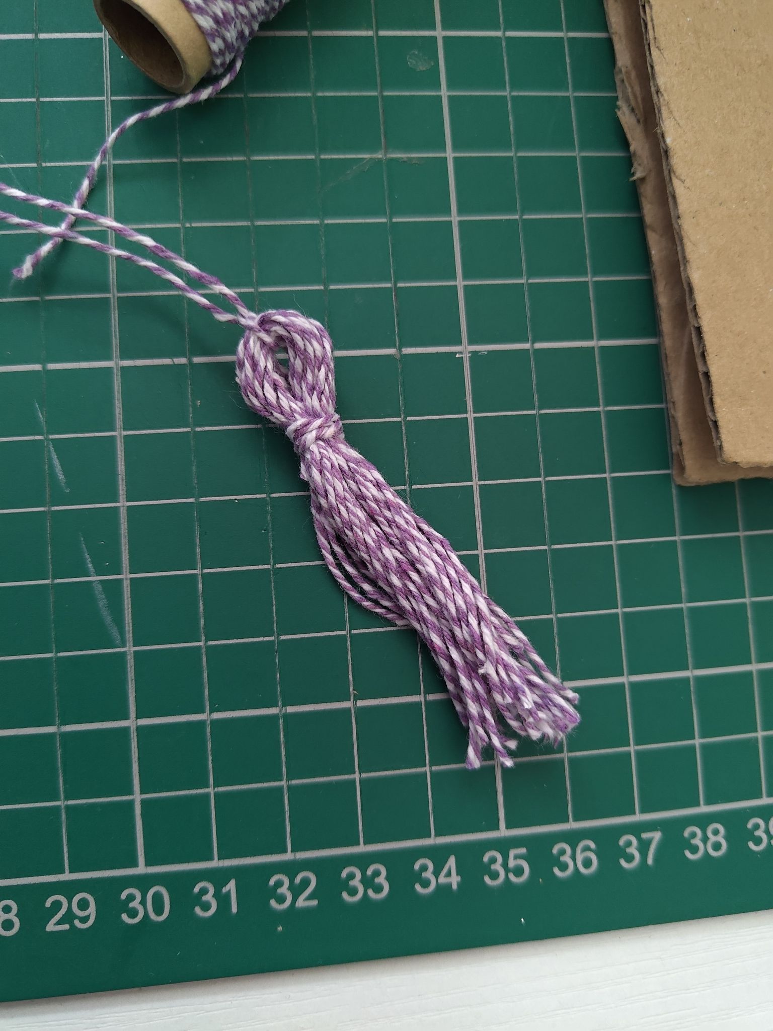 A trick to making a tassel is to have a folded piece of cardboard with the thread going through it. You wrap the thread around the cardboard multiple times and then cut the thread on the edge – the inner thread can then gather up all loose threads and you can add a secure knot afterwards.