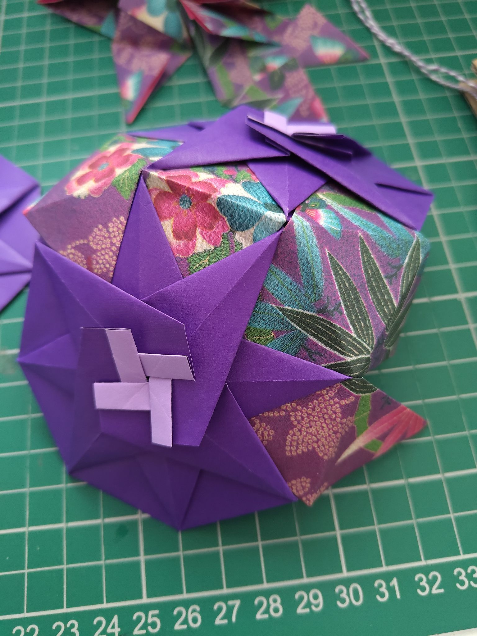 A few days ago, I randomly flipped some pages and picked out a model from the Tomoko Fuse book “Kusudama Origami – Hana Kiriko” and started making bits for it, until I realised that I had already done this model 10 years ago! Even the same month too. The only variation is that the old one was smaller and was a Type C – the window for each cube face has a slightly different design.