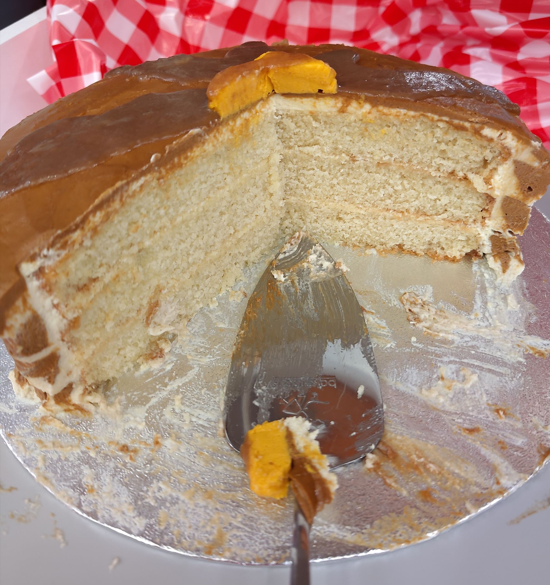 Bonus picture: The cross section of the cake, after a few people had already helped themselves to it! I was a bit reserved with the frosting between the layers as I thought I didn’t have enough, but I ended up having a lot left over. I had a bit leftover to take home – it was as delicious as I hoped it would be!