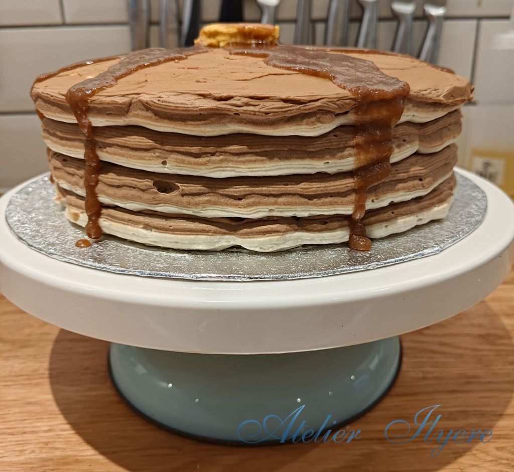 I saw this Short by @MessyBaker comparing her two different attempts at a “stack of pancakes” cake. The first one looked very cartoony yet gave the best illusion, but the second one did not use any fondant. This was a good test for me – I have been recently exploring cake frostings that do not use icing or confectioner’s sugar as the main ingredient as it can be very sweet and feel gritty.