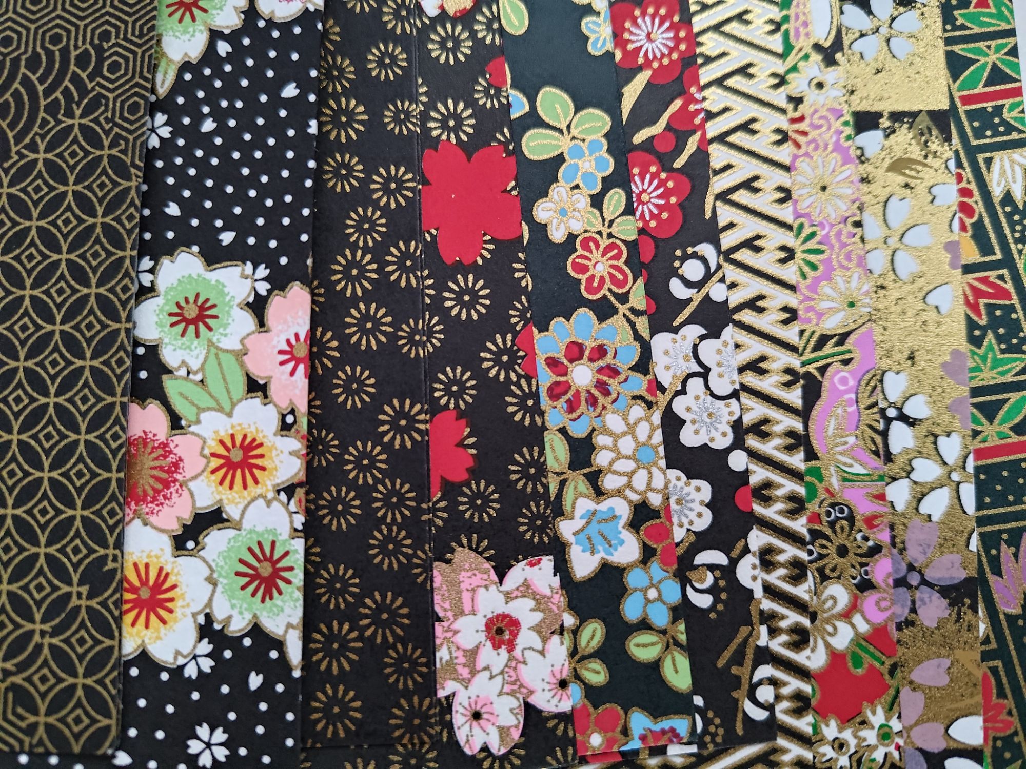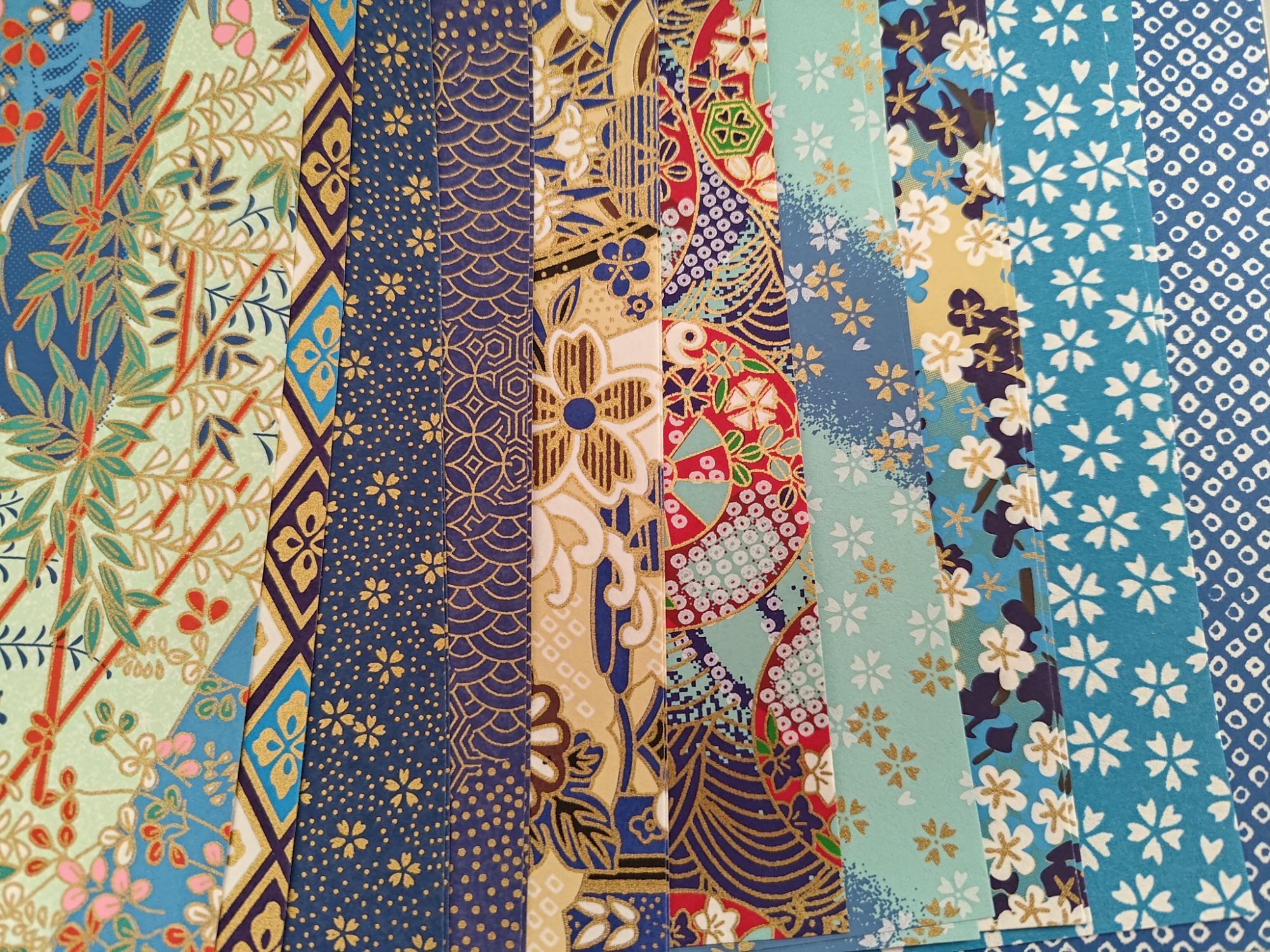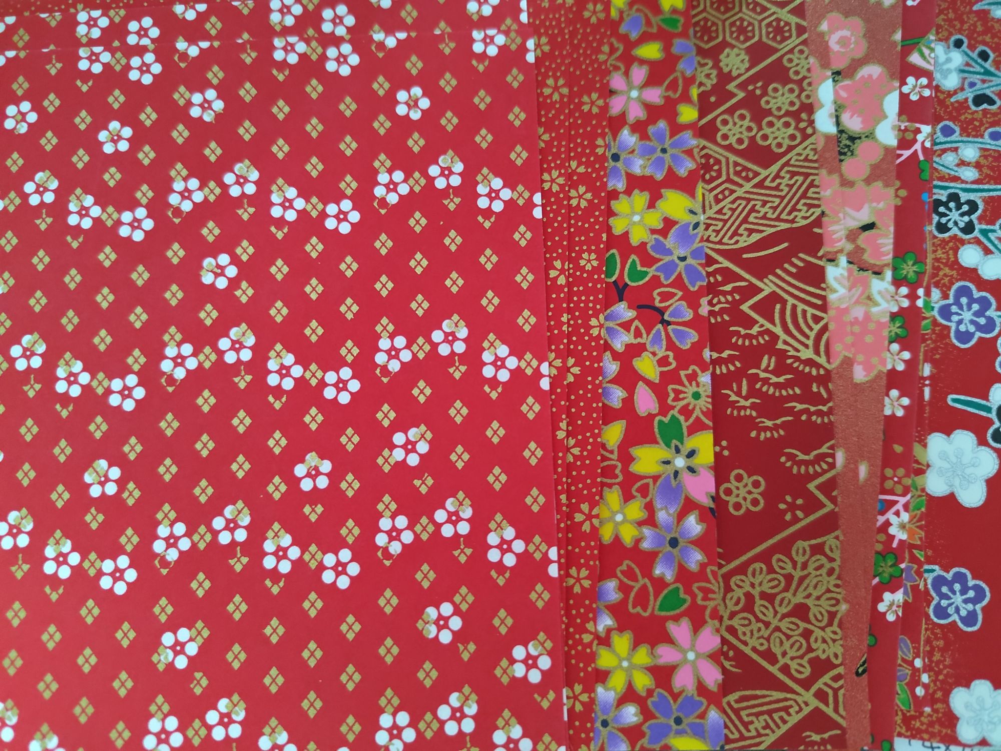 The yuzen washi packs I got are gorgeous. Each pack is a pack of 20 mixed patterned sheets in 14cm square size. I found that all my packs were 10 colours of two sheets each, with lovely gold reflections on most of the patterns. I ordered practically every colour I could get my hands on and it turned out to be a happy coincidence… I now have red, black, blue, green, purple, pink, and gold packs. The pink isn’t pictured below because I forgot to take a photo, and the green set was actually a green-and-gold-themed pack so I did some swapping around with an assorted pack that I also purchased to get a full set of green-themed washi. The gold pack will be pictured later, because I am using it for a different purpose.