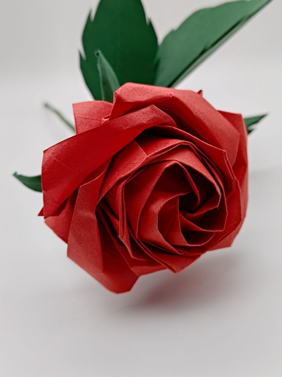 Origami pentagon rose by Naomiki Sato, single stem with leaves.